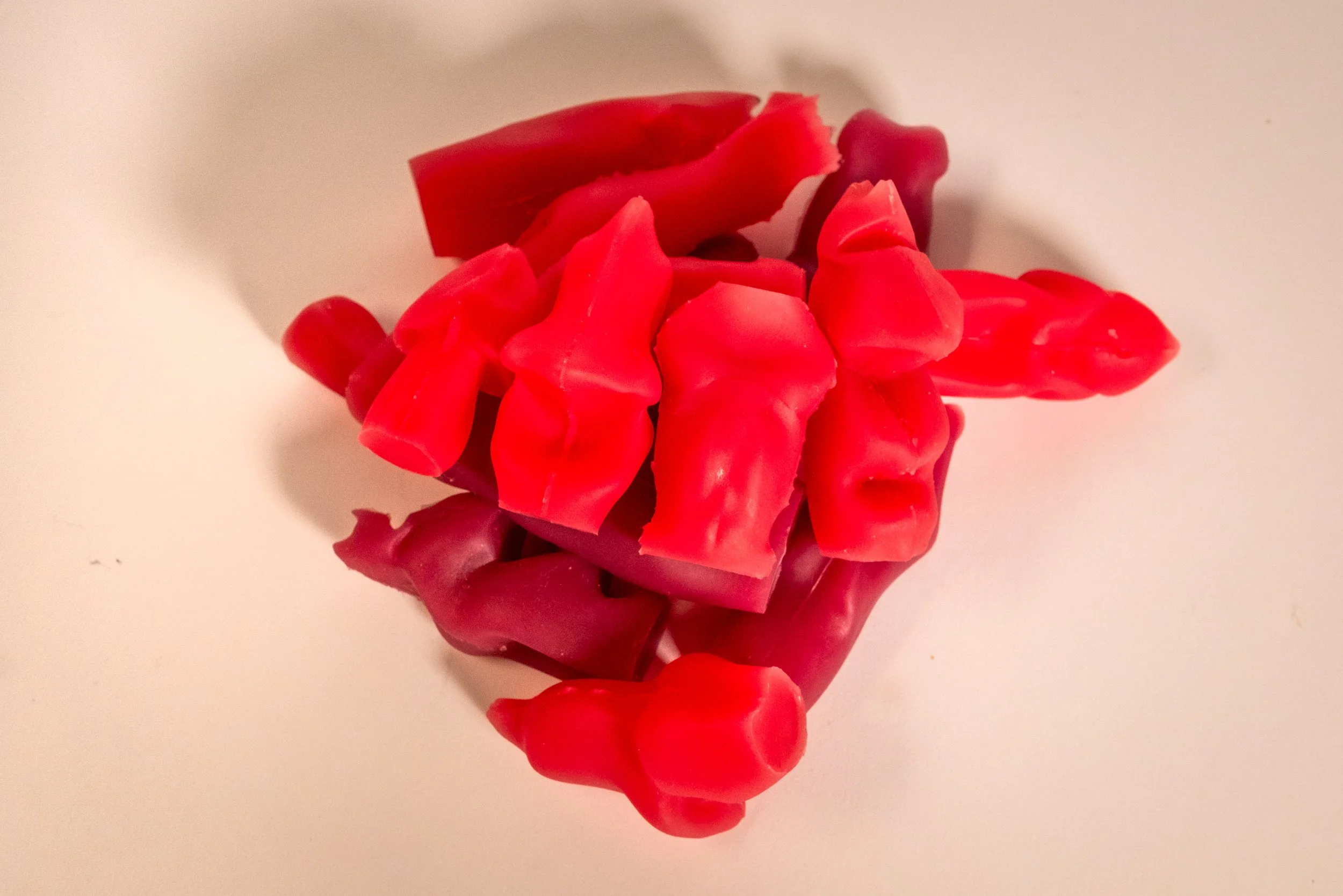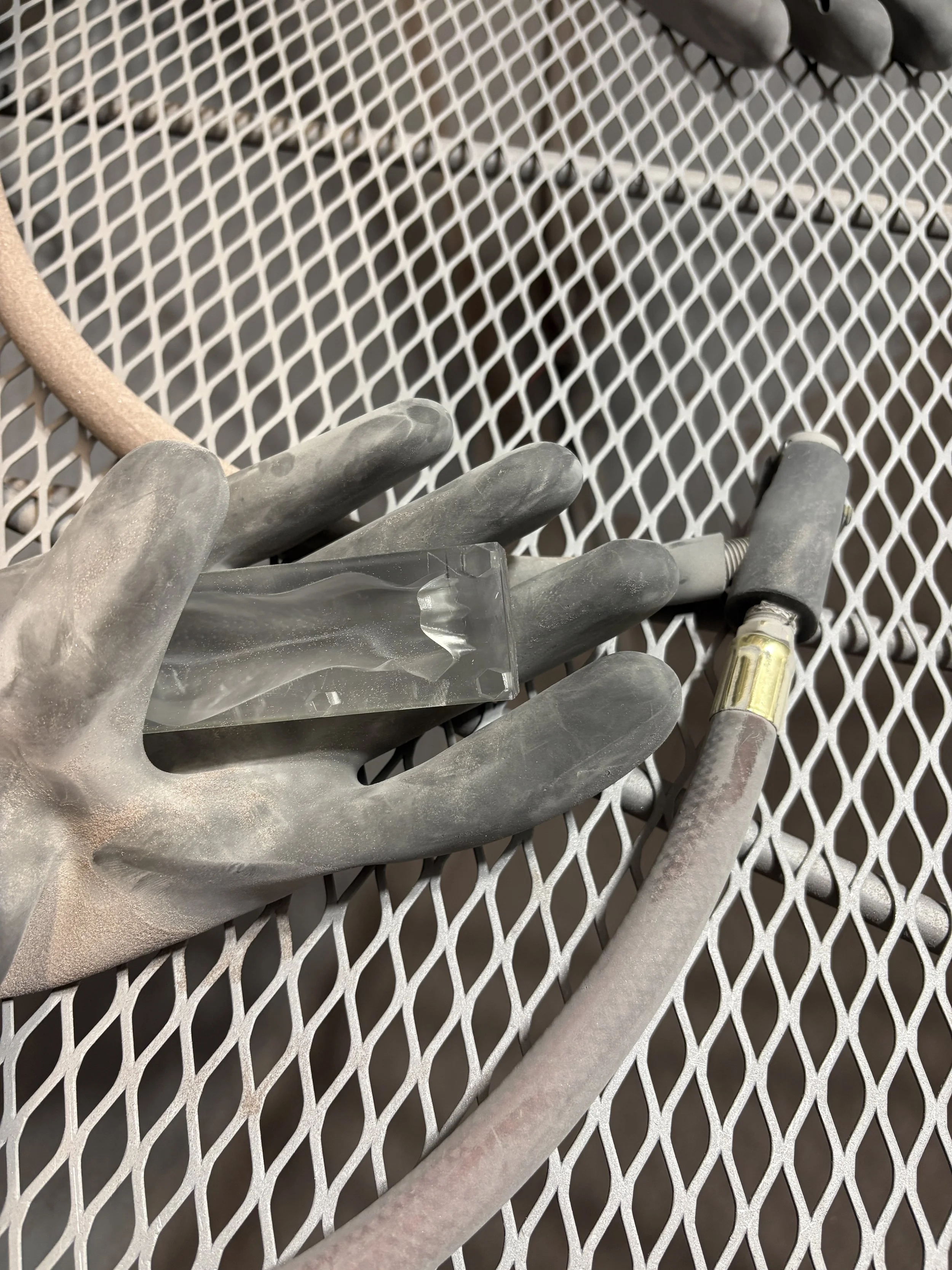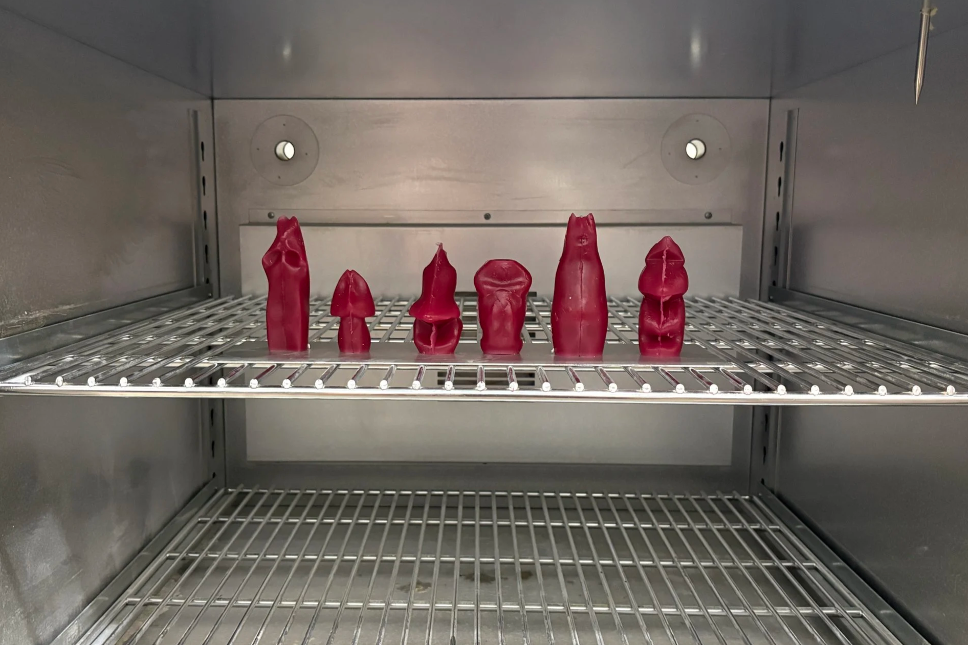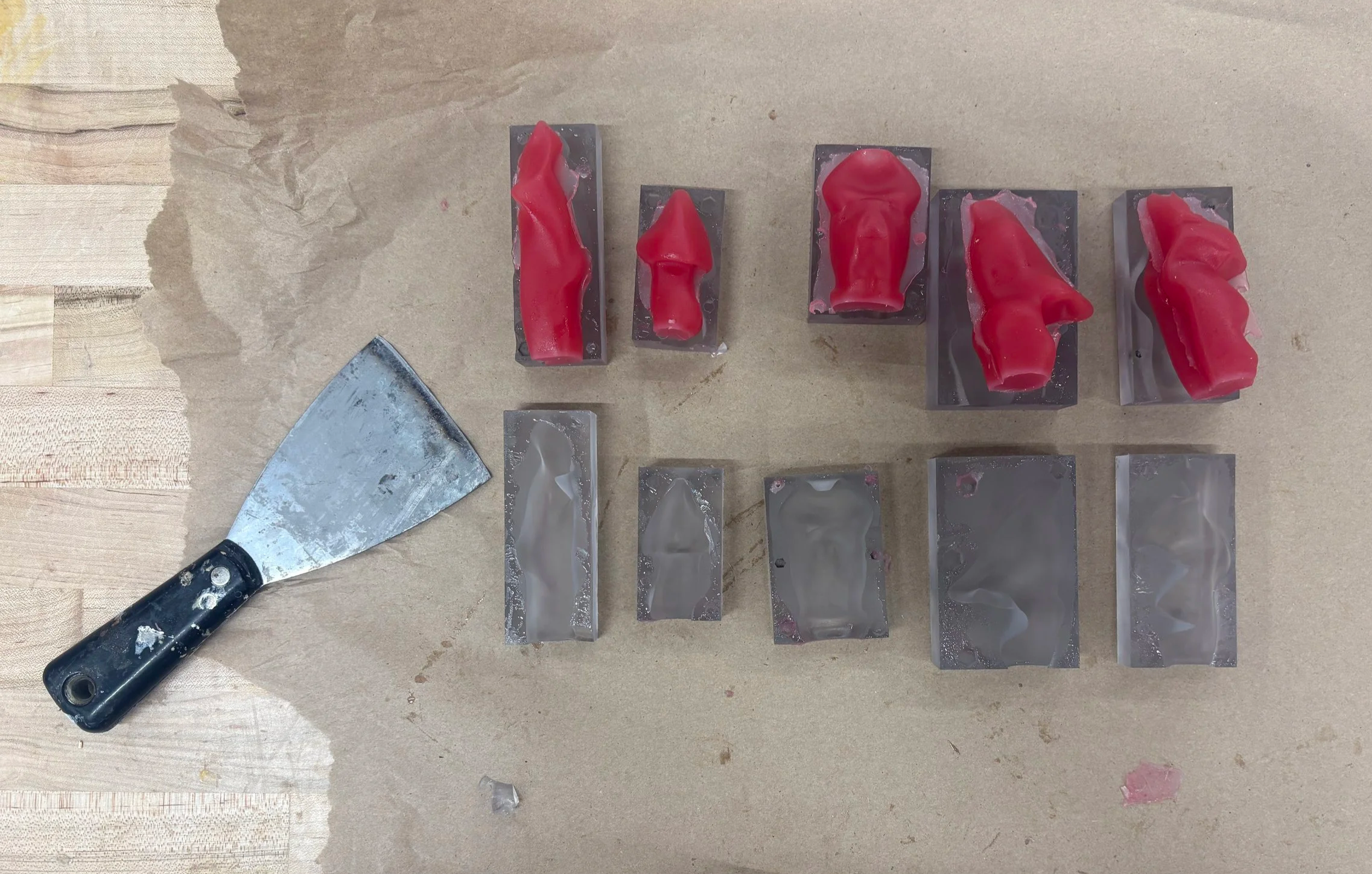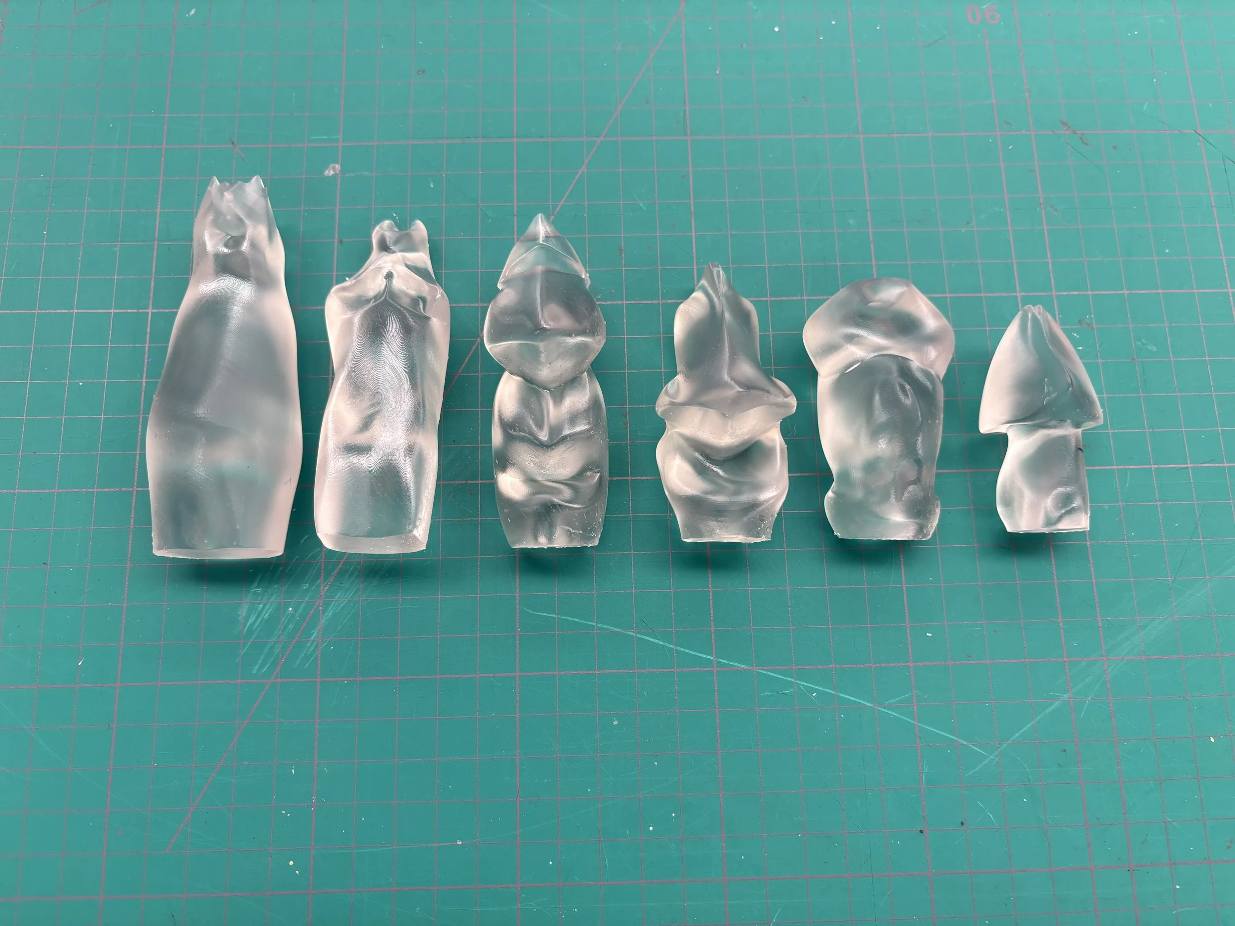 I first tried to make a two part silicone gang mold of sandblasted resin prints. However, airbubbles caused a few surface defects which made it unusable as a mold for silicone parts.